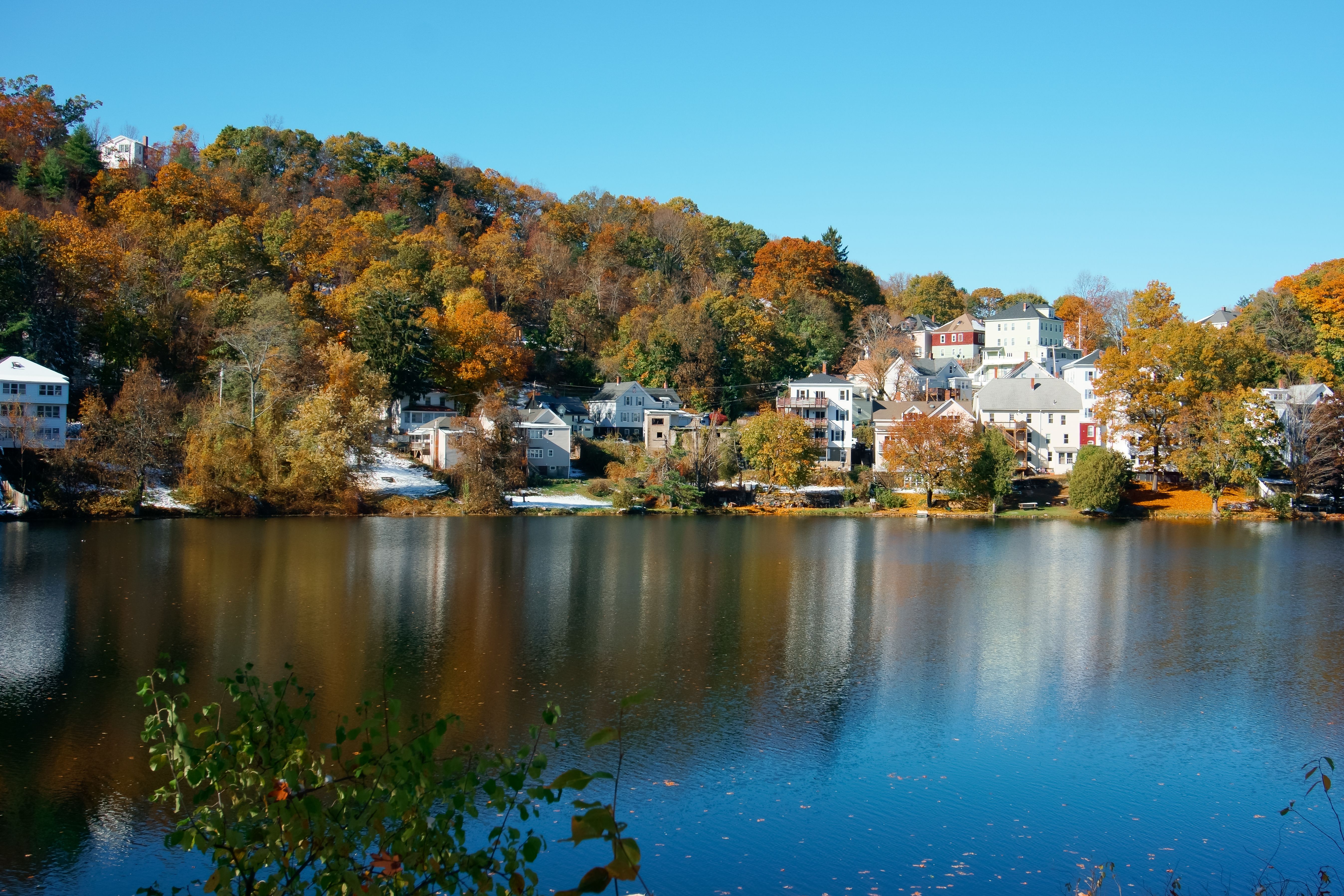 マサチューセッツ州クリントンのワチューセット貯水池にある湖畔の家々