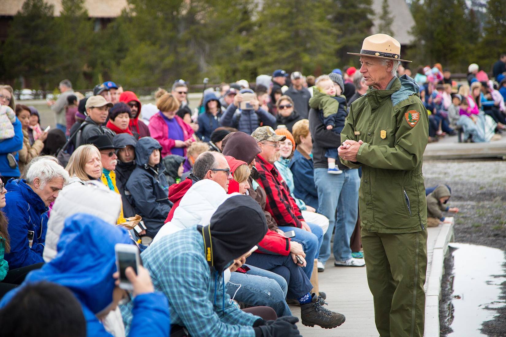 アメリカ、イエローストーン国立公園のオールド・フェイスフル・ガイザーで群衆の前で講演する国立公園レンジャー クレジット: Neal Herbert / Wikimedia Commons