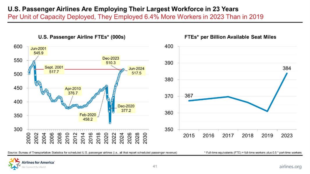 航空業界の米国経済に対する重要性についてより大きな見解を示すために、このセクターは1,000万人の雇用をサポートし、2023年の1.37兆ドルに相当する米国GDPの5%を推進しています。