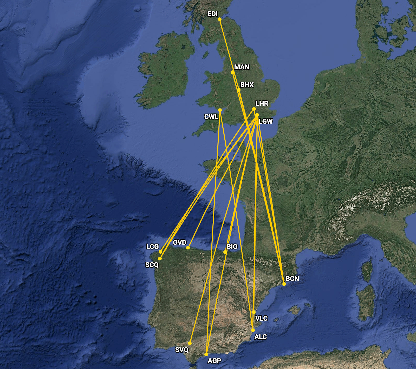 (LHR)ビルバオ空港(バイオ)とサンティアゴ・ロサリア・デ・カストロ空港(SCQ)へのサンティアゴ・デ・コンポステラにサービスを提供し、両方の空港がスペイン北部にあります。