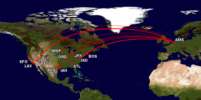 同月中、同社はオランダの首都から米国まで週85便の旅程を計画しており、ビジネスクラス装備の航空機で旅行中にデルフト・ブルー・ハウスを手に入れるための豊富なオプションを提供している。 KLMオランダ航空が10月に運航する米国の目的地は次のとおりです。