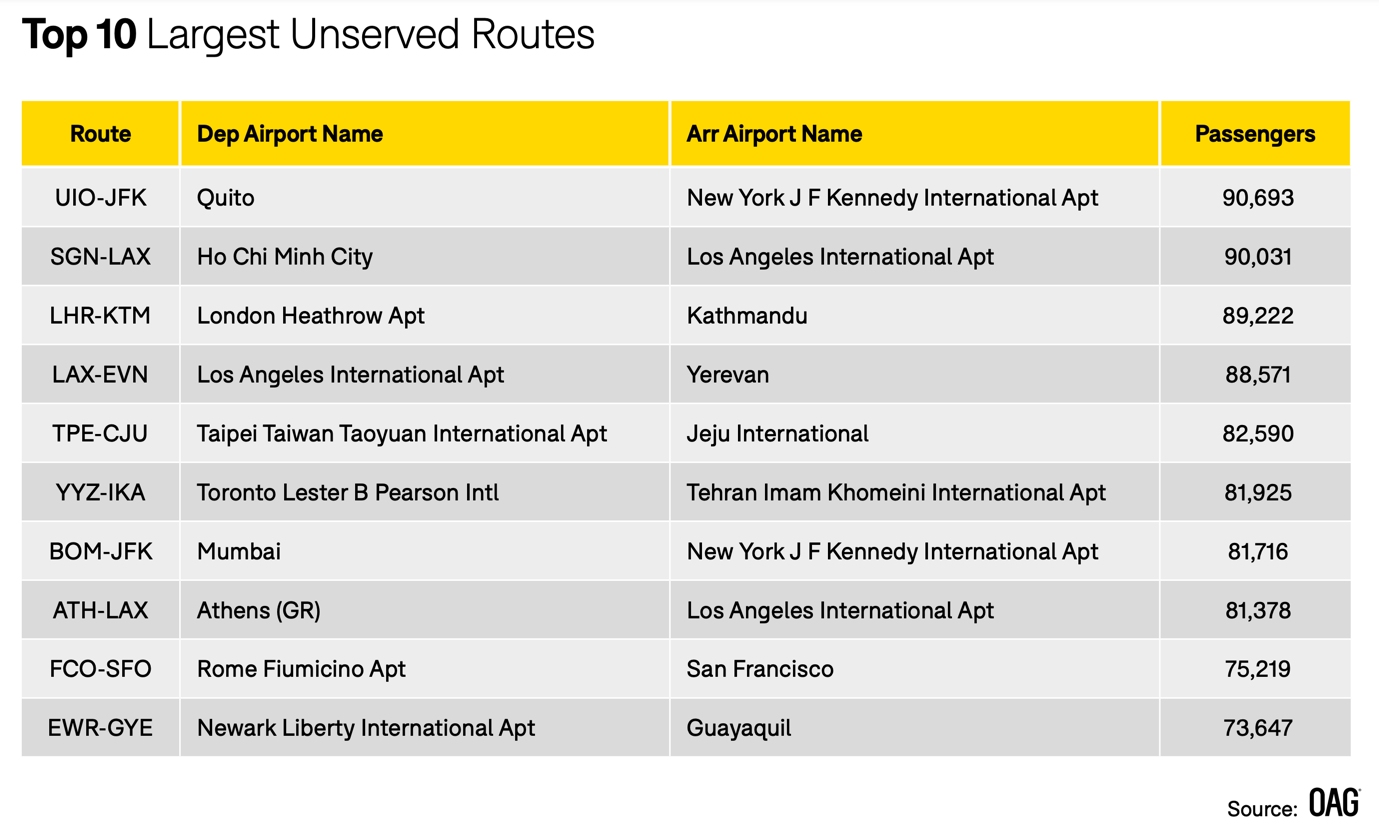 航空会社は継続的にデータを分析し、2 つの都市間で開設できる可能性のあるルートを探していますが、一部のルートでは直接接続を維持するのに十分な需要がまだありません。世界的な旅行データプロバイダーOAGは、2022 年にどの航空会社も直接運航していないこれらの路線のリストをまとめており、Simple Flying ではその一部について次の記事で取り上げています。
