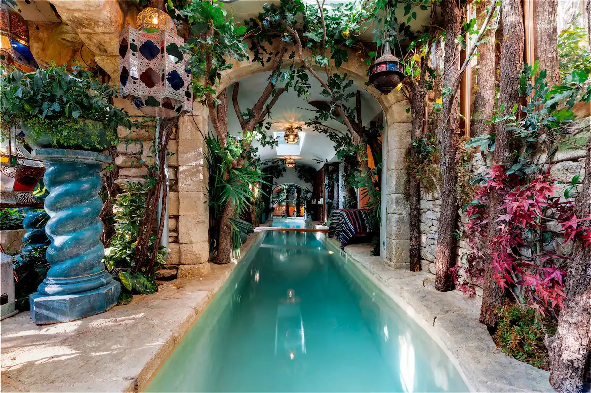 石造りのパティオにはかぎ爪足のバスタブがあり、敷地を二分する狭いプールがあり、木の板で横切ることができます。私の知る限り、賃貸物件のほとんどには壁がありません。