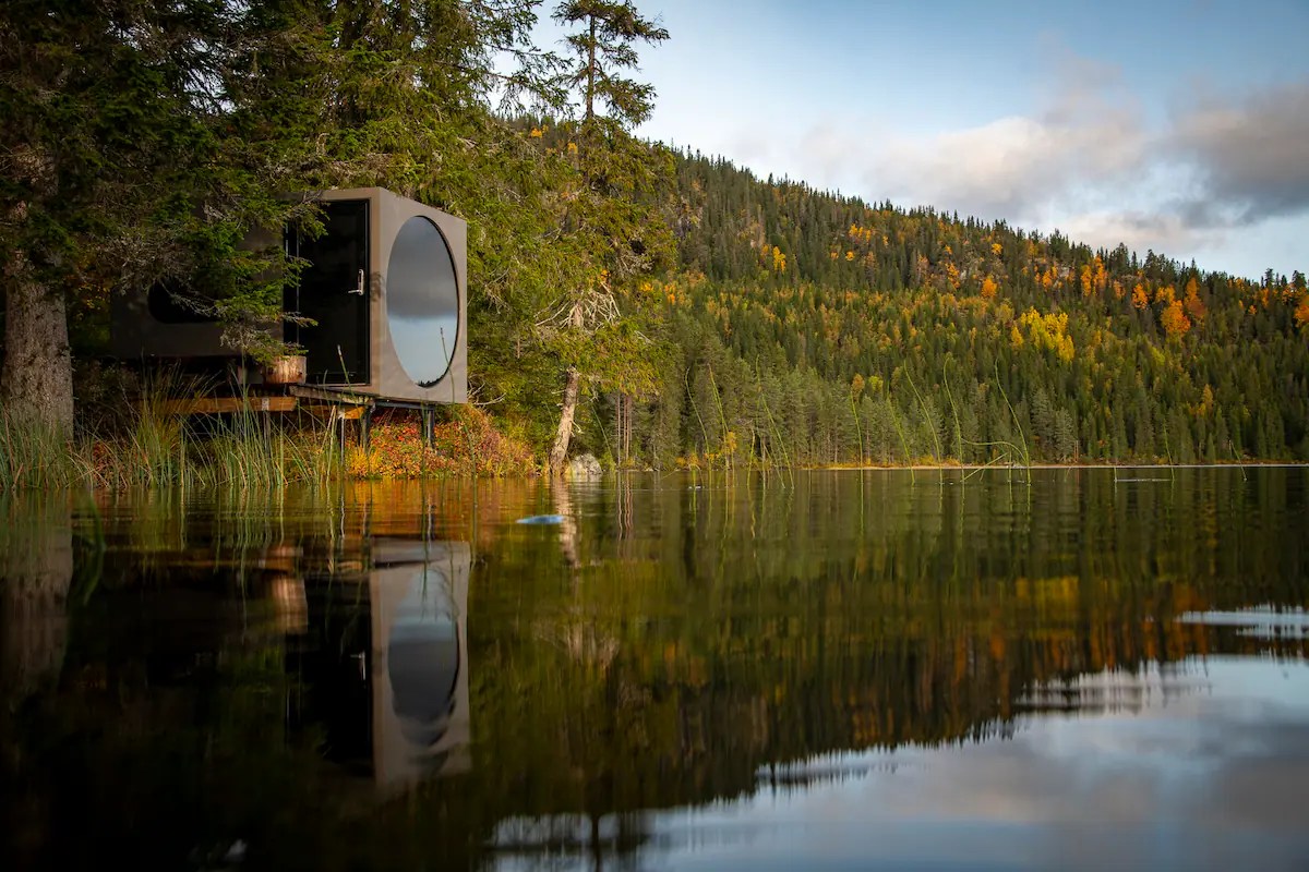 この小さな家からはノルウェーの美しい湖を見渡すことができます。大きな円形の窓を通して湖の景色を楽しむことができます。