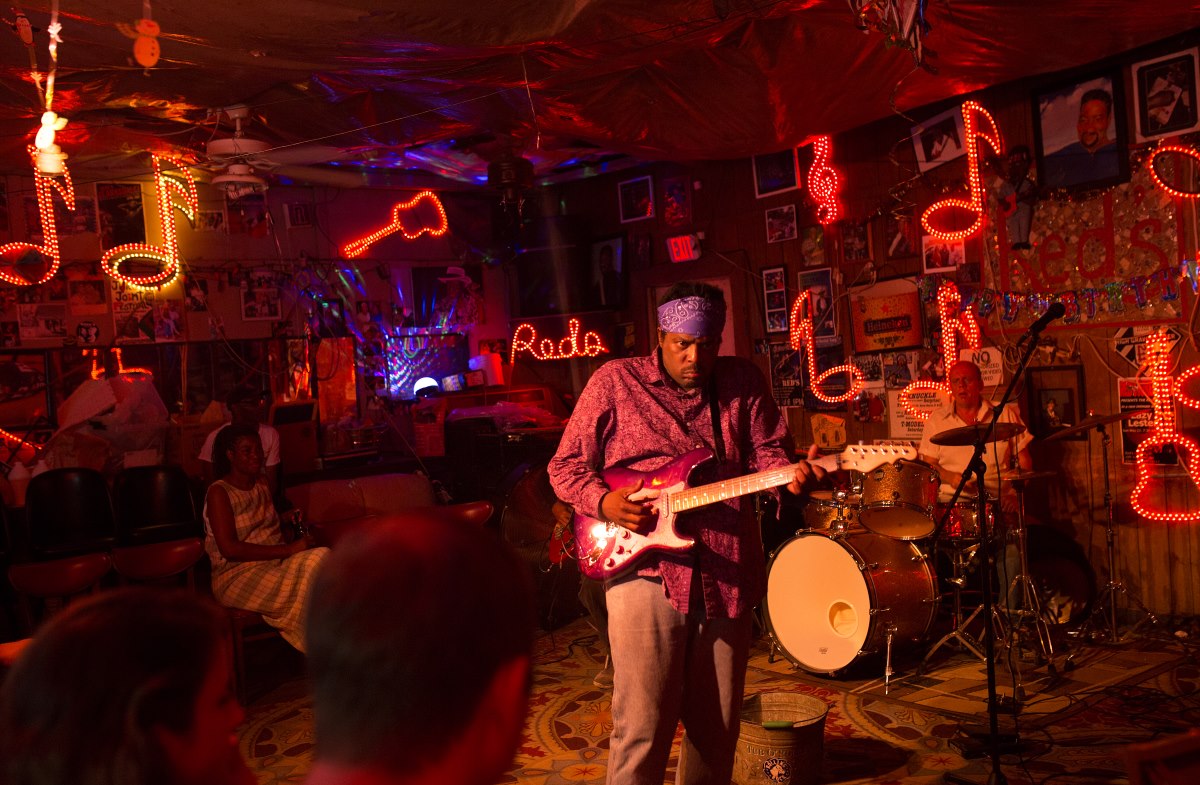 ブルースマンのルーシャススピラーは、ミシシッピ州クラークスデールのレッドラウンジで指を指に心に注ぎます。