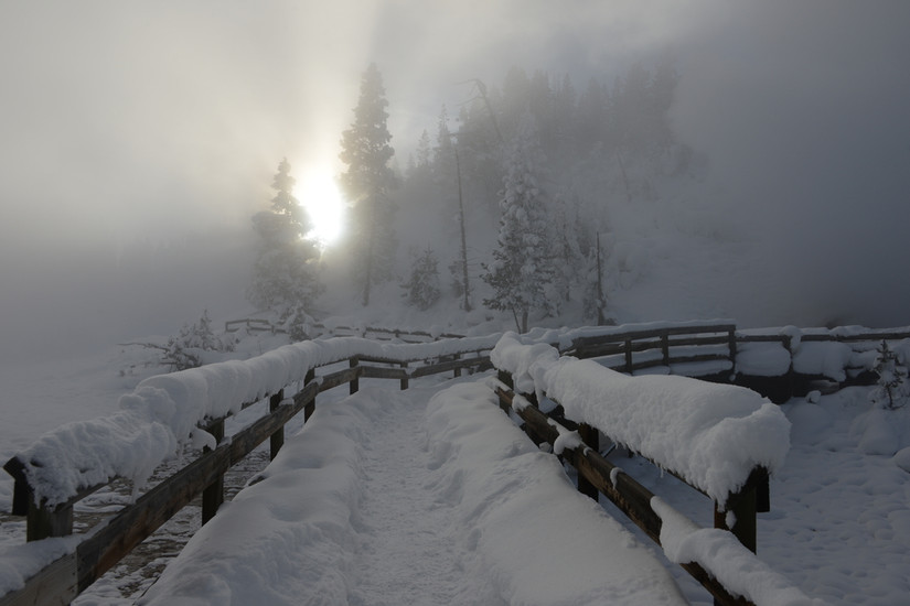 冬のイエローストーン国立公園の雪に覆われた歩道橋クレジット: Shutterstock