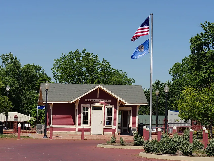 オクラホマ州ポールズバレーにあるアムトラックの駅と切符売り場の正面図。編集クレジット: RaksyBH / Shutterstock.com