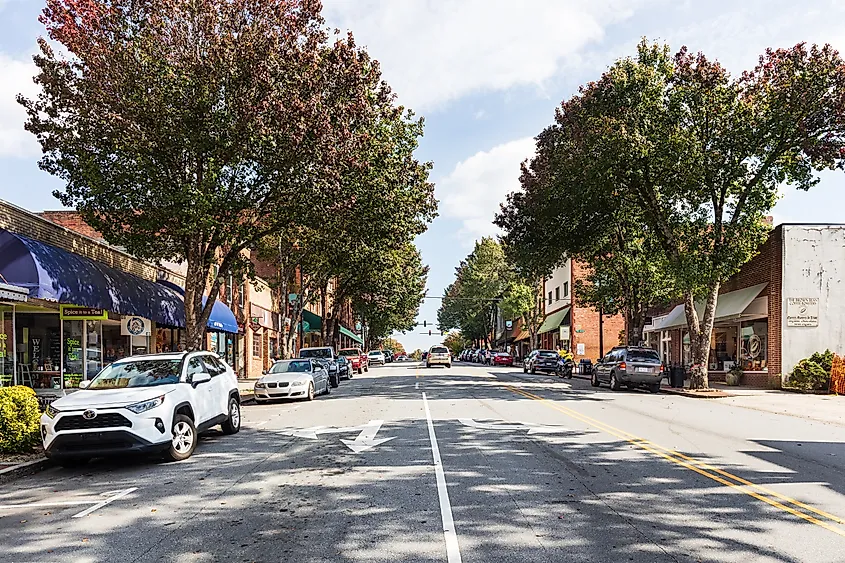 ノースカロライナ州ブレバードのメインストリートの両側に並ぶ建物。画像クレジット Nolichuckyjake、Shutterstock より。