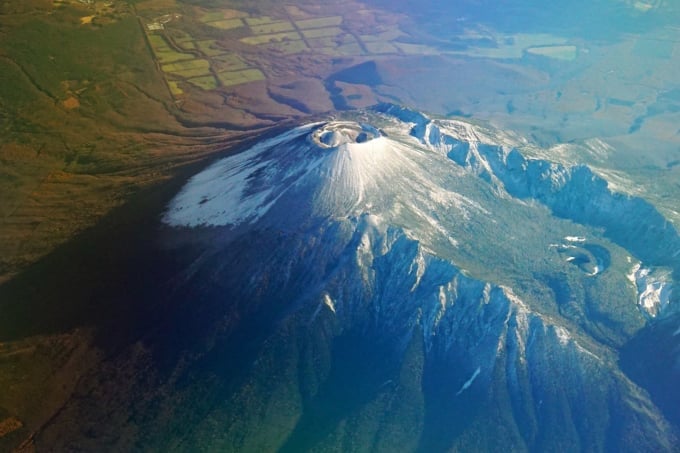 岩手山は北側が八幡平市、南東側が滝沢市、南西側が雫石町の3市町にまたがっています。上空から見ると、岩手山がカルデラを持つ活火山であることがわかります。