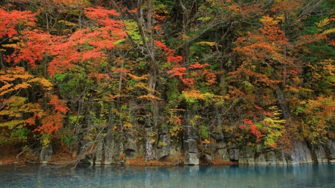松川渓谷では、劇的な玄武岩の地層とともに、カエデ、ブナ、その他の広葉樹などの色とりどりの葉が織りなす自然のタペストリーが見られます。玄武岩の崖の垂直の縞模様は、秋の鮮やかな赤や黄色の紅葉と美しく調和する、見事な幾何学的な背景を形成しています。