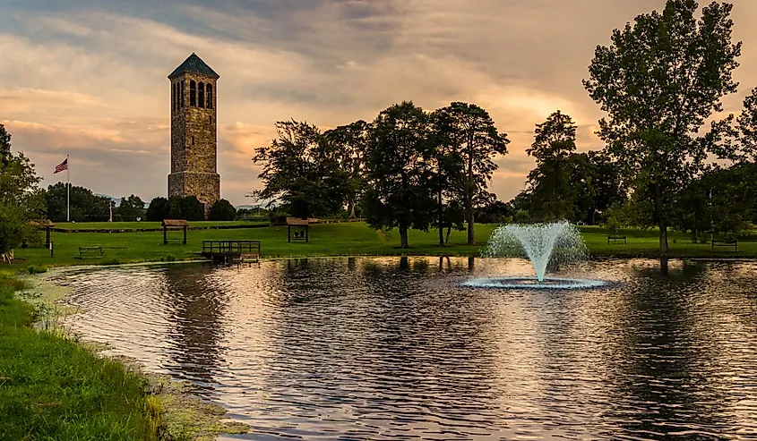 バージニア州ルーレイのカリヨン・パークにある歌う塔と池。