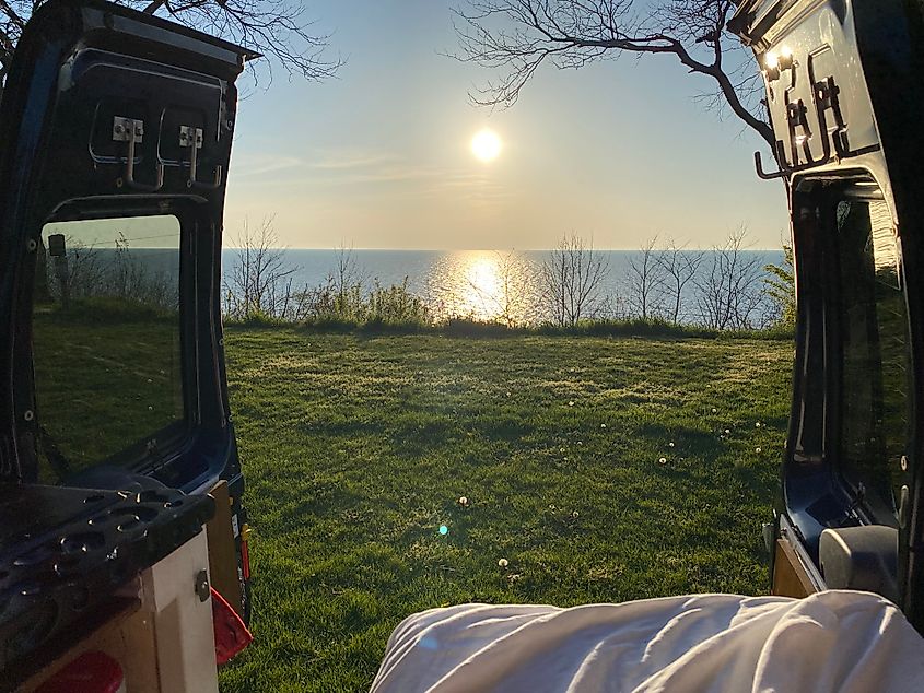 リトル トラバース ベイ (ミシガン湖北東部) に囲まれたペトスキーは、ゆっくりとした旅行者にとって四季折々の休息の場所です。エメット郡のこの郡庁所在地は、170 以上のショップやレストランが並ぶダウンタウンの地区であるガスライト ショッピング地区、アーネスト ヘミングウェイの史跡 (有名なアメリカの小説家が短期間ここに住んでいた)、クルックド ツリー アート センター、そして自分で冒険できる豊富な屋外レクリエーション (夏のリトル トラバース ホイールウェイのサイクリング、春のキノコ狩り、冬のスキーやスケートまで) で知られています。しかし、ペトスキーの最もリラックスした観光スポットは、おそらく町からわずか数マイル北にあるその名の由来の州立公園でしょう。私はバンライフツアー中にこの宝石に出会い、ビーチサイドのプラットフォームの1つでフレンドリーな旅行者に迎えられ、そこでみんなで美しい夕日を眺めました。