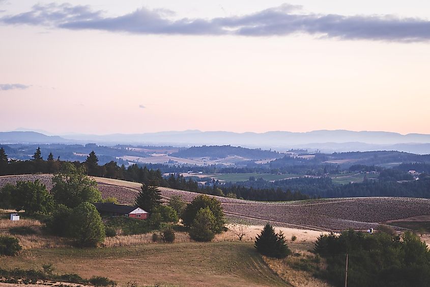 オレゴン州ニューバーグのなだらかな丘の風景。