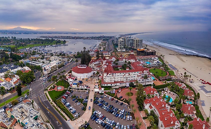 カリフォルニア州コロナドにあるホテル デル コロナドとその他の建物の空撮。