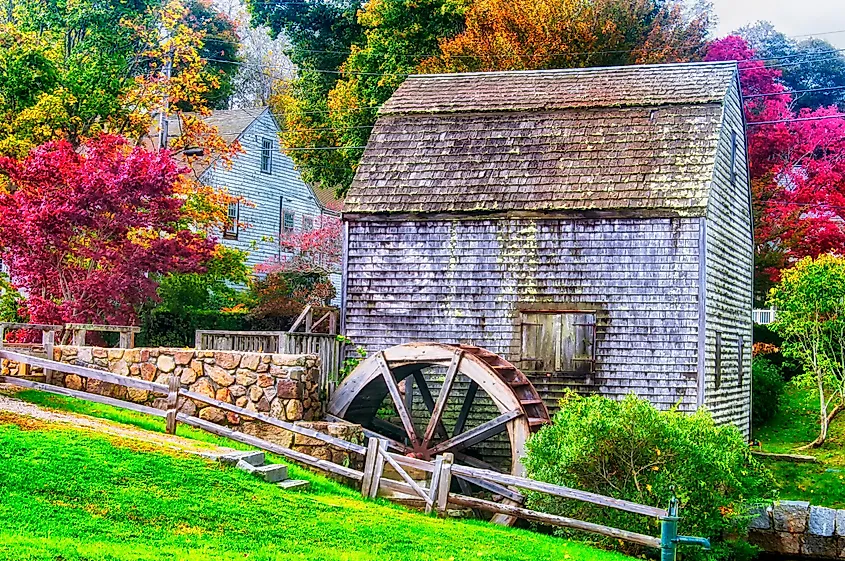 ニューイングランド、マサチューセッツ州サンドイッチにあるデクスターグリストミルと水車のランドマーク。
