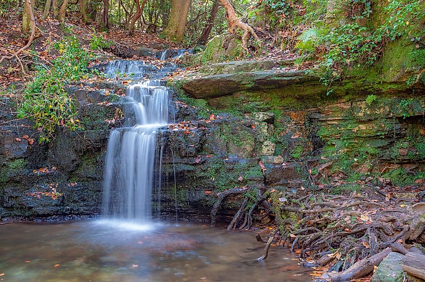 ジョージア州パイン マウンテンにある滝。緑豊かな環境の中に自然の滝が現れます。