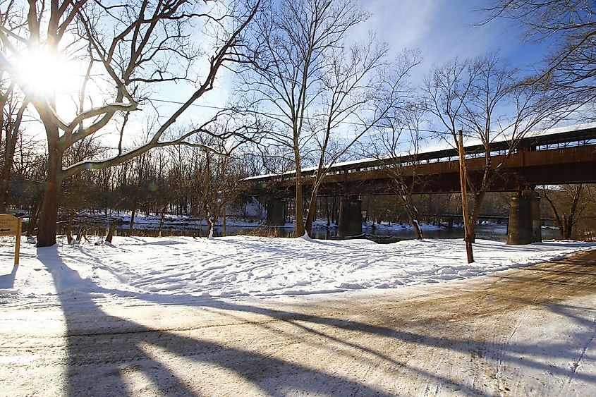 オハイオ州ウェインズビルのリトル マイアミ川にかかるコーウィン M. ニクソン屋根付き橋。