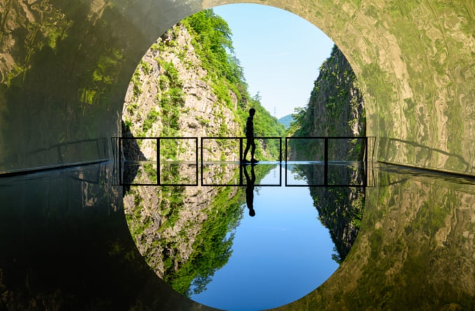 清津峡は、新潟の田舎の最高の自然美です。しかし、10年近く前に安全上の懸念から川沿いのハイキングコースが一般の立ち入りを禁止したとき、人々はそれについて何かをするよう要求した。その解決策は、清津渓谷展望トンネルとしても知られる「光のトンネル」でした。このトンネルは、渓谷の印象的な景色を提供する絵のように美しいパノラマステーションで頂点に達します。
