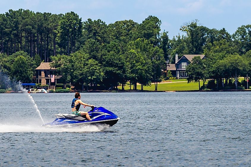ジョージア州グリーンズボロのオコニー湖でジェットスキーに乗って夏の一日を楽しむ男性。画像クレジット: The Toidi / Shutterstock.com