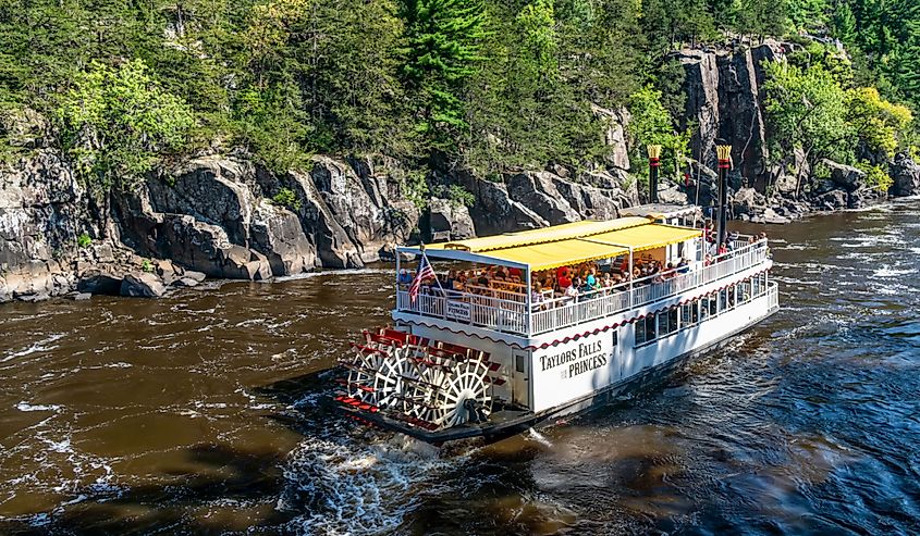 テイラーズ フォールズ インターステート パークのセント クロイ川を流れるプリンセス リバー ボート。画像クレジット Ken Wolter、Shutterstock より