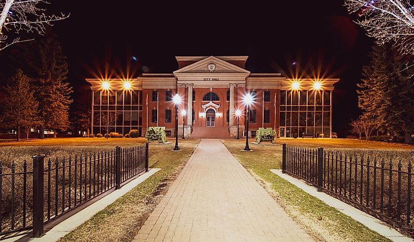 夜にアルバータ州のウェタスキウィン歴史市庁舎。