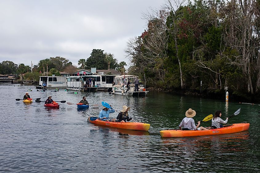 世界中から観光客がフロリダ州クリスタルリバーのスリーシスターズスプリングスを訪れます。編集クレジット: Nicole Glass Photography / Shutterstock.com