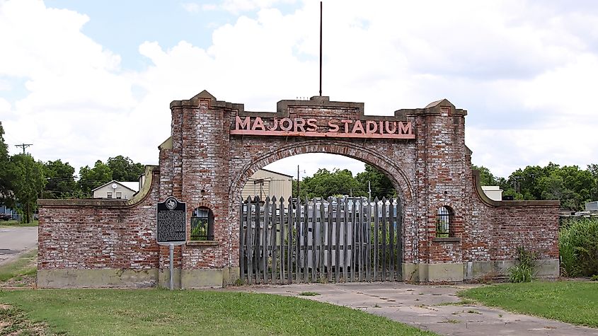 米国テキサス州グリーンビルのメジャー スタジアム入口、ラリー D. ムーア著、CC BY 4.0、ウィキメディア・コモンズ