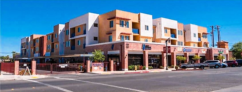 カリフォルニア州インペリアルにある店舗が立ち並ぶ住宅広場。 JacobSA2019 著、CC BY-SA 4.0、ウィキメディア コモンズ