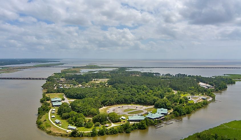アラバマ州スパニッシュ フォートにあるファイブ リバーズ デルタ リソース センターの空撮。