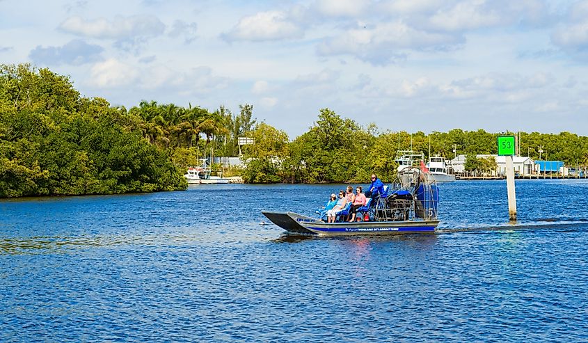 フロリダ州エバーグレーズシティのバロン川沿いを走るエアボート。