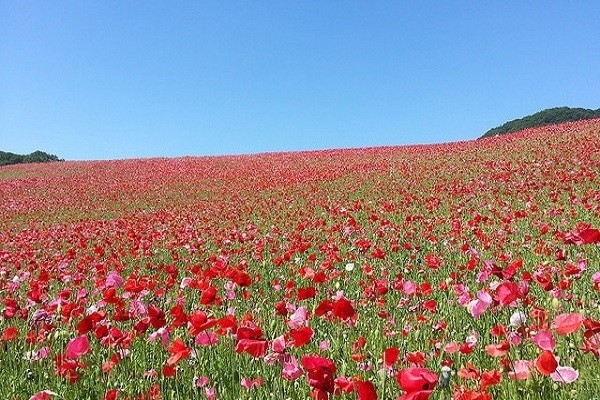 皆野町と東秩父村の境に位置する「天空のポピー」は、秩父・皆野のみならず、埼玉を代表する観光名所の一つです。広大な斜面に約1,500万本のケシが植えられています。ポピーは5月末頃に真っ赤な花を咲かせます。鮮やかな赤いケシの花と青い空、そして初夏の新緑のコントラストが魅惑的な光景を生み出します。この美しい光景をカメラに収めようと多くの観光客が訪れます。