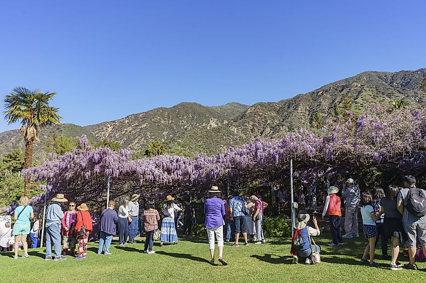 カリフォルニア州シエラマドレで世界最古の藤の花の展示を鑑賞する人々。編集クレジット: Kit Leong / Shutterstock.com