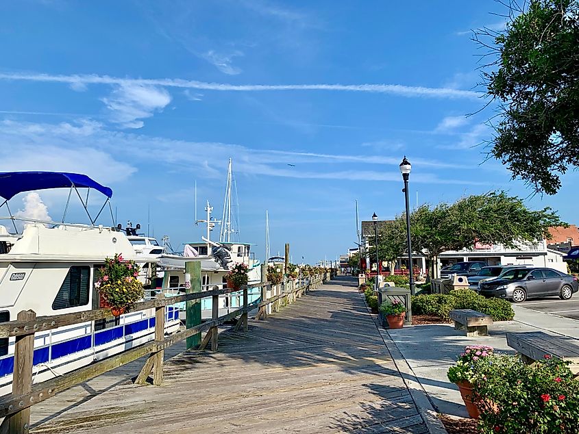 ノースカロライナ州ビューフォート: ウォーターフロントの遊歩道での美しい夏の日。
