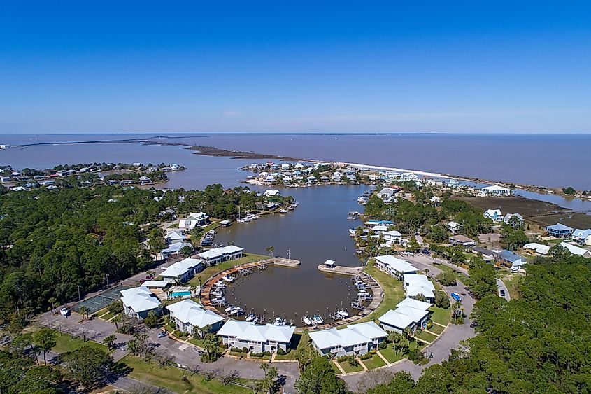 澄んだ青空の下、アラバマ州ドーフィン島の小さなボート港。