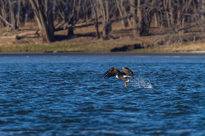 アイオワ州ル・クレアを流れる川で釣りをするアメリカのハクトウワシ。