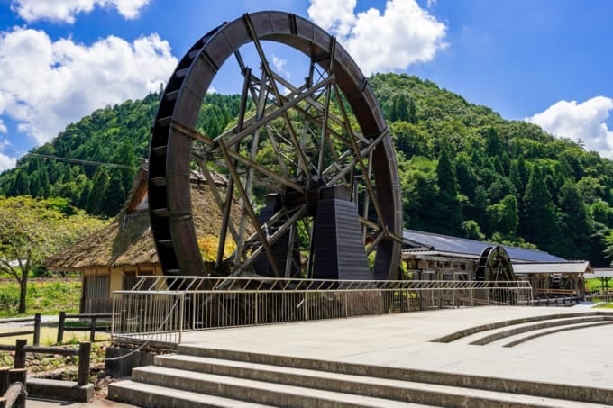 この公園には「親子水車」と呼ばれる大小3つの水車が展示されています。何を意味するのかと思われるかもしれませんが、単に大きさの異なる 3 つの水車が並んでいることを指します。水車は復元されていますが、その大きさはとても印象的です。最大の水車は高さ13.6メートルで、水車が実際に使われていた昭和中期を彷彿とさせます。記念撮影の背景としても最適です。