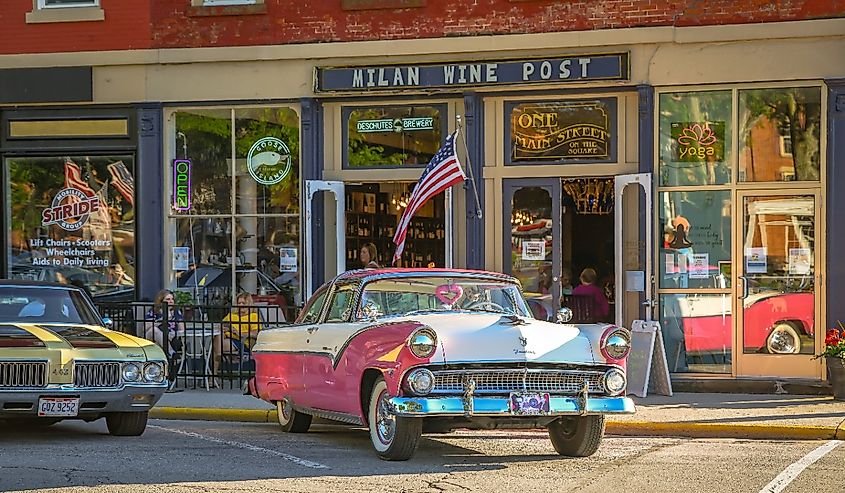 オハイオ州ミラノの地元の店の前に、美しいピンク色のフォードが駐車されている。画像クレジット Keith J Finks(Shutterstock.com 経由)