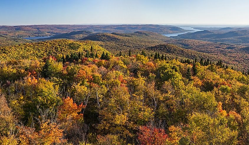 ニューヨークのアディロンダック山脈にあるハドリーマウンテンマウンテンズのグレートサカンダガ湖のカラフルな秋の景色。