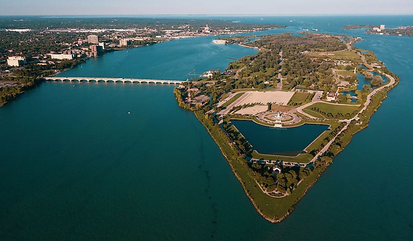 ミシガン州デトロイトのベル アイル パークの空撮。