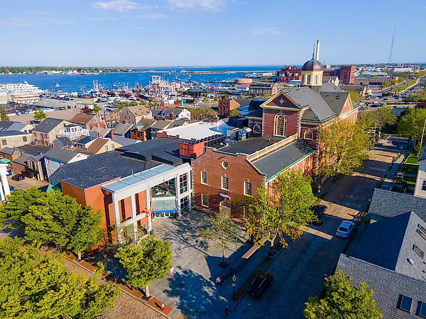 マサチューセッツ州ニューベッドフォードの歴史的なダウンタウンにあるニューベッドフォード捕鯨博物館の建物の空撮