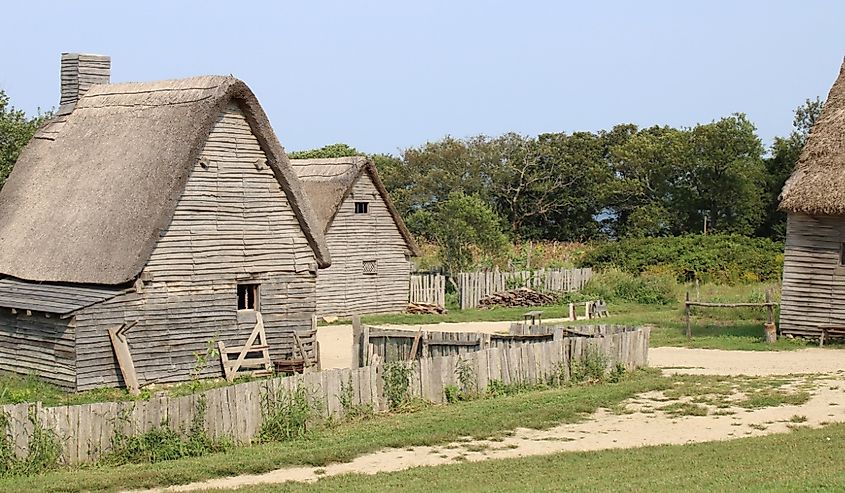 プリモス パタクセット博物館にある 1600 年代の植民地時代の住宅と村のレプリカ。編集クレジット: Jaclyn Vernace / Shutterstock.com