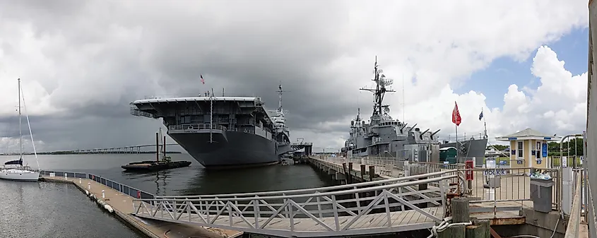 マウント・プレザントのパトリオッツ ポイントでは、第二次世界大戦の空母が水上博物館になった強力な USS ヨークタウンに乗って海軍の歴史が生き生きと展示されています。訪問者は、飛行甲板、潜水艦内部、ベトナム戦争と名誉勲章に関する展示品を探索できます。このサイトは、何世代にもわたるアメリカ軍人にも敬意を表しています。チャールストン港に位置し、息を呑むような水の景色を眺めることができます。アーサー ラベネル ジュニア橋を歩いたりサイクリングしたりしてパノラマの景色を眺める冒険を続けたり、水上で新鮮なシーフードを提供する地元の人気店、ザ レック オブ ザ リチャード & シャーリーンで軽食を楽しんだりもできます。