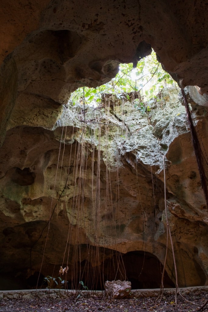 洞窟の名前は、壁を覆う緑の藻に由来しています。上から伸びる木の根が別世界のような雰囲気を醸し出しています。