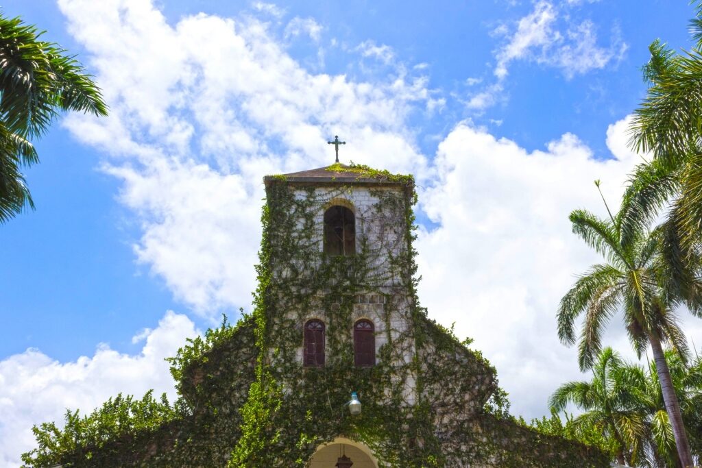 ここはカリブ海の教会としては最も美しい環境の 1 つです。この教会は、熱帯植物が咲き誇り、ヤシの木が木陰を作る大きな教会の庭の中に立っています。