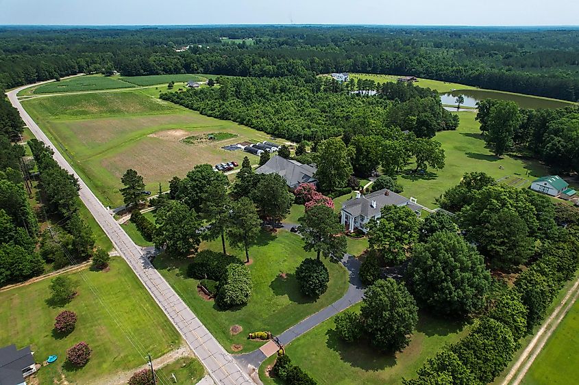 ノースカロライナ州中部の結婚式場と農場からの航空景色