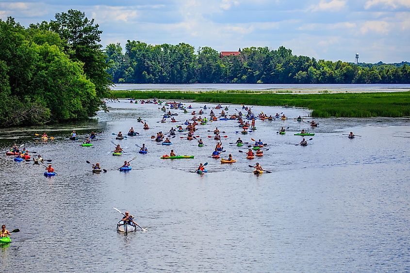 ウィスコンシン州ウォーソーで開催された第 4 回パドルパブ クロールで角を曲がって来るカヤッカーたち。編集クレジット: Michael Tatman / Shutterstock.com