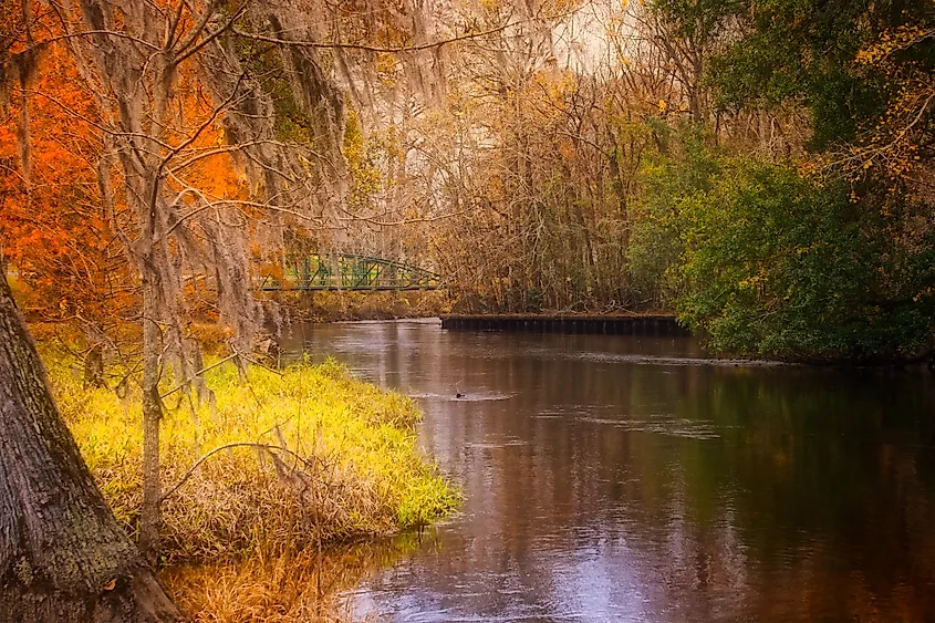 サウスカロライナ州オレンジバーグの紅葉に囲まれたエディスト川。