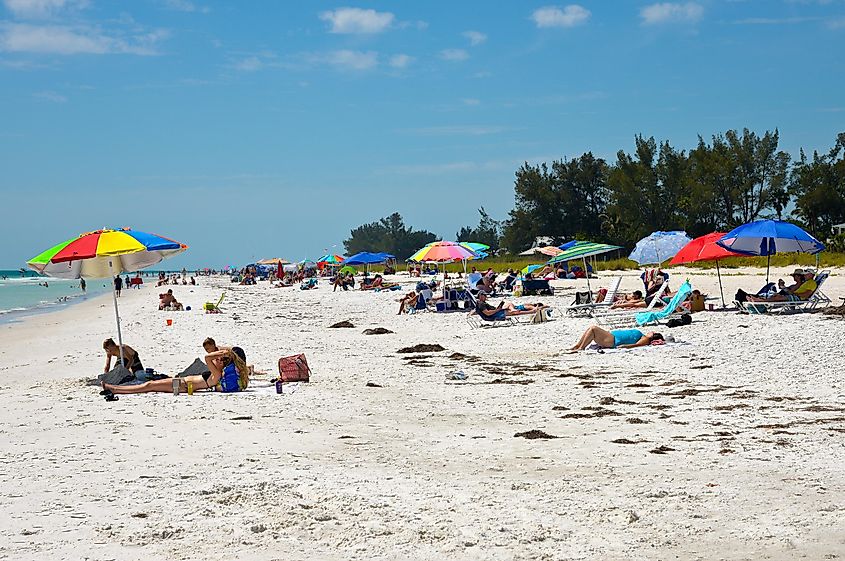 アンナ マリア島のビーチで日光浴を楽しむ海水浴客、EyeMark / iStock.com より