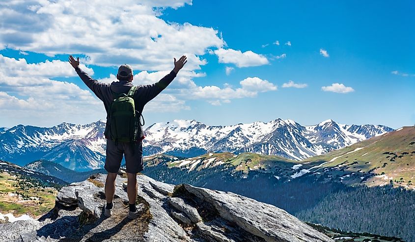 コロラド州ロッキー山脈国立公園の山の頂上に腕を上げて立つハイカー