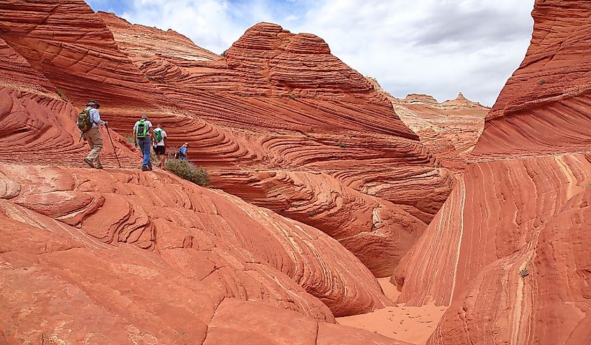 ユタ州カナブの波の下の赤い砂岩の峡谷に降りてくるハイカー。 ShutterStock経由の画像クレジットJustPixs